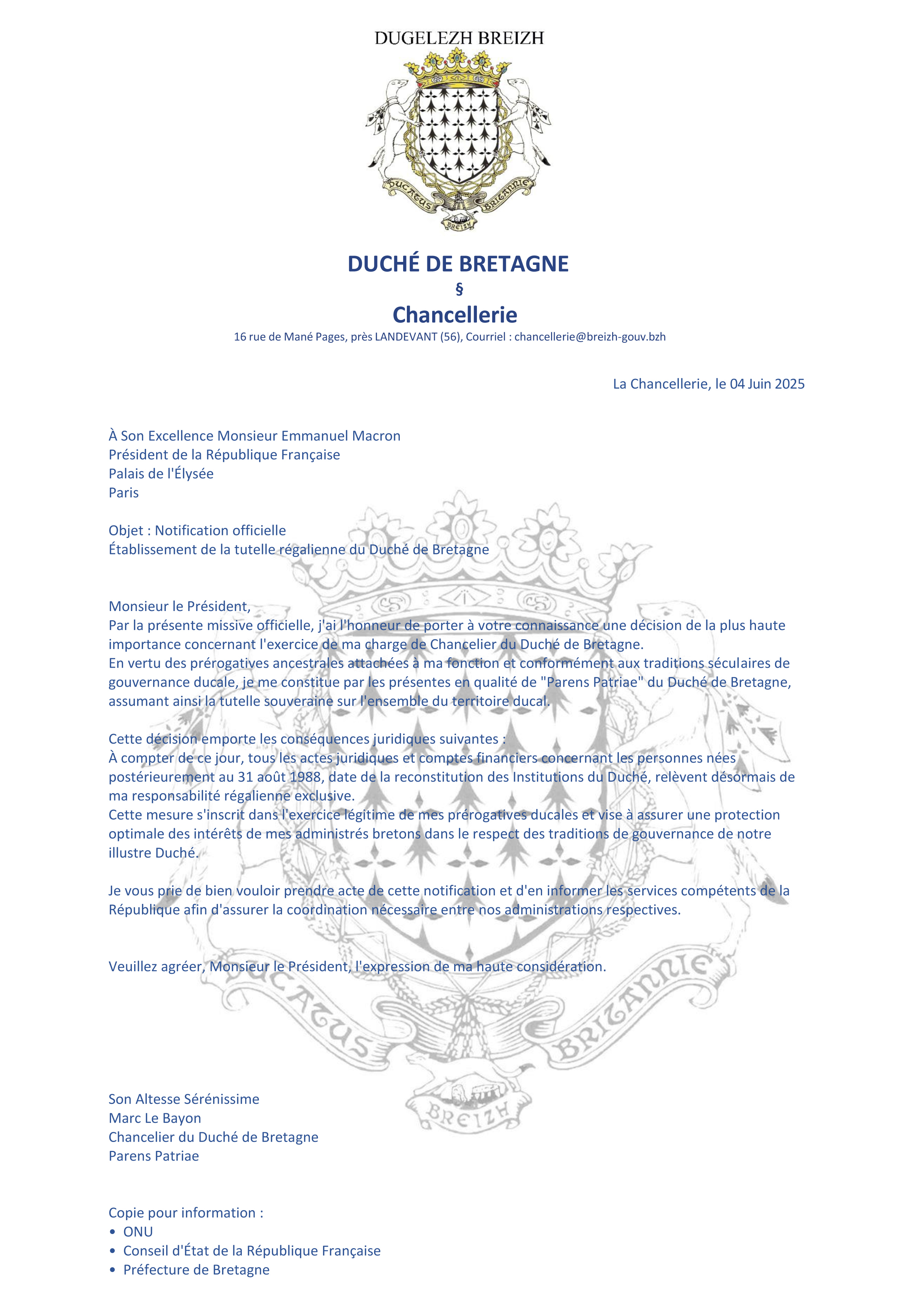 Alors que Marc Le Bayon prétendant agir en qualité de Chancelier du Duché de Bretagne après avoir déposé des Copyrigths sur les drapeaux Gwenn Ha Du et sur le Kroaz Du aux hermines et le Kroaz Du Ratio, ainsi que sur le contrat de mariage de Anne de Bretagne avec le Roi Louis XII, tente par la suite de mettre sous tutelle la jeunesse Bretonne en laissant libre cours aux agissements des Tribunaux Judiciaires sur le territoire de Bretagne et ce malgrés les protestations énergiques des Ministres dont le Ministre de la justice et Gardes des Sceaux, lui même mis en place en cette qualité sans avoir préalablement été avisé et sans en avoir obtenu son consentement. La Cour de Common Law du Duché de Bretagne, réunie au nom du peuple Breton et après que Marc Le Bayon soit de manière légitime cité à comparaître, est avec cette décision unanime Clame /Ordonnance de destitution de son poste de Chancelier qu’il prétend détenir par auto proclamation devant deux témoin qui seraient à ce jour décédés. Ainsi Justice est rendue au nom du peuple breton et par le peuple breton et est remise entre les mains du peuple breton pour suite à donner et à qui appartiennent les drapeaux bretons par le biais du Duché de Anne de Bretagne restauré au même titre que la liberté du peuple breton et son droit à l’auto détermination, droit des nations.